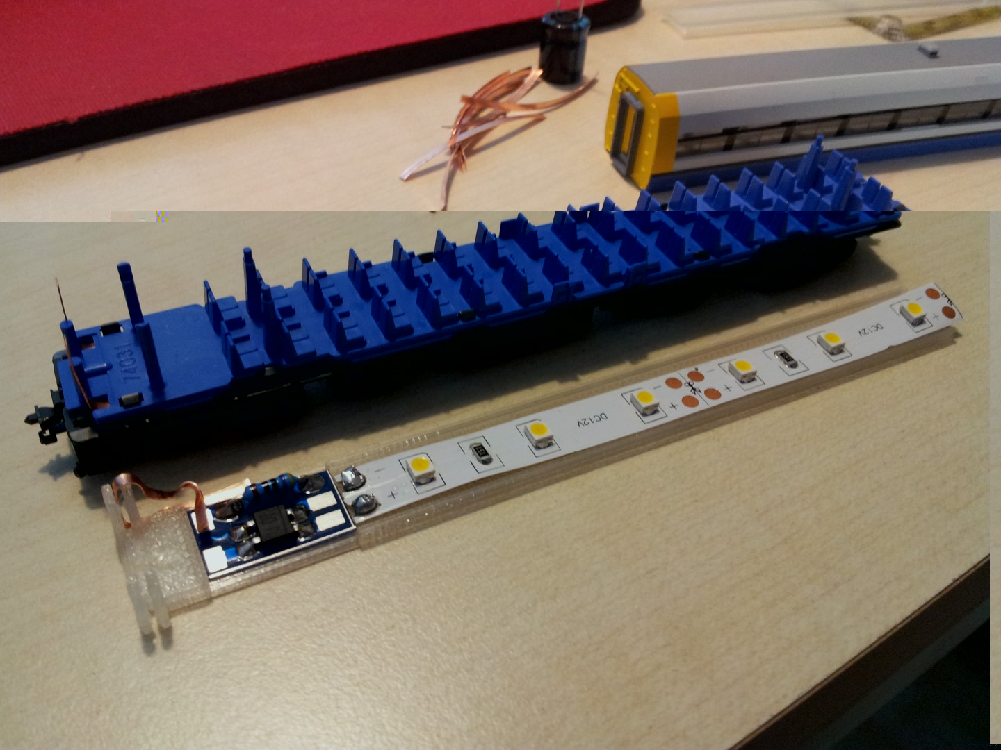 Was mir jetzt noch fehlt ist ein praktikabler Weg um die Beleuchtung nicht am Wagendach festkleben zu müssen, sowie möglichst wenig Kabelverhau. Eine Idee ist ein Streifen 120x10mm auf dem der LED Streifen und der Brückengleichrichter ist, der gleichzeitig auf den vorgesehenen Stützen liegt. An diesem Streifen sind dann entweder Federbeine (die noch zu besorgen wären), oder aber hat der Streifen Beinchen in denen auch Metallstreifen sind und auf die Streifen von der Stromabnahme gesteckt werden.