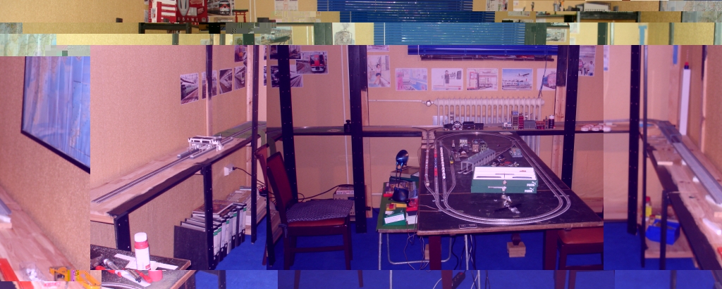 Nach meinem Urlaub wollte ich etwas optimistischer in die Zukunft Blicken und habe meine Regale wieder aufgebaut. Sie besitzen eine tiefe von 30 cm. Die Regale sind nun an der Front schwarz gestrichen, unter der dem Trassenbrett wir mit schwarzen Stoff ein Sichtschutz angebracht. Das Gleisdreieck dient nun als Anschluss des kleinen Ovals an den großen Knochen, der nach links ländlich, nach Rechts großstädtisch wird. Die ganze Strecke ohne Schnörkel. Ja, natürlich ist es schöner, wenn sich ein Zug irgendwo lang schlängekt. Doch ich möchte wenigstens 7teilige Züge fahren lassen. Damit muss ich dann auch gut einen Meter Bahnsteig einplanen. Da bleibt nicht mehr viel Platz zum rumkurven.