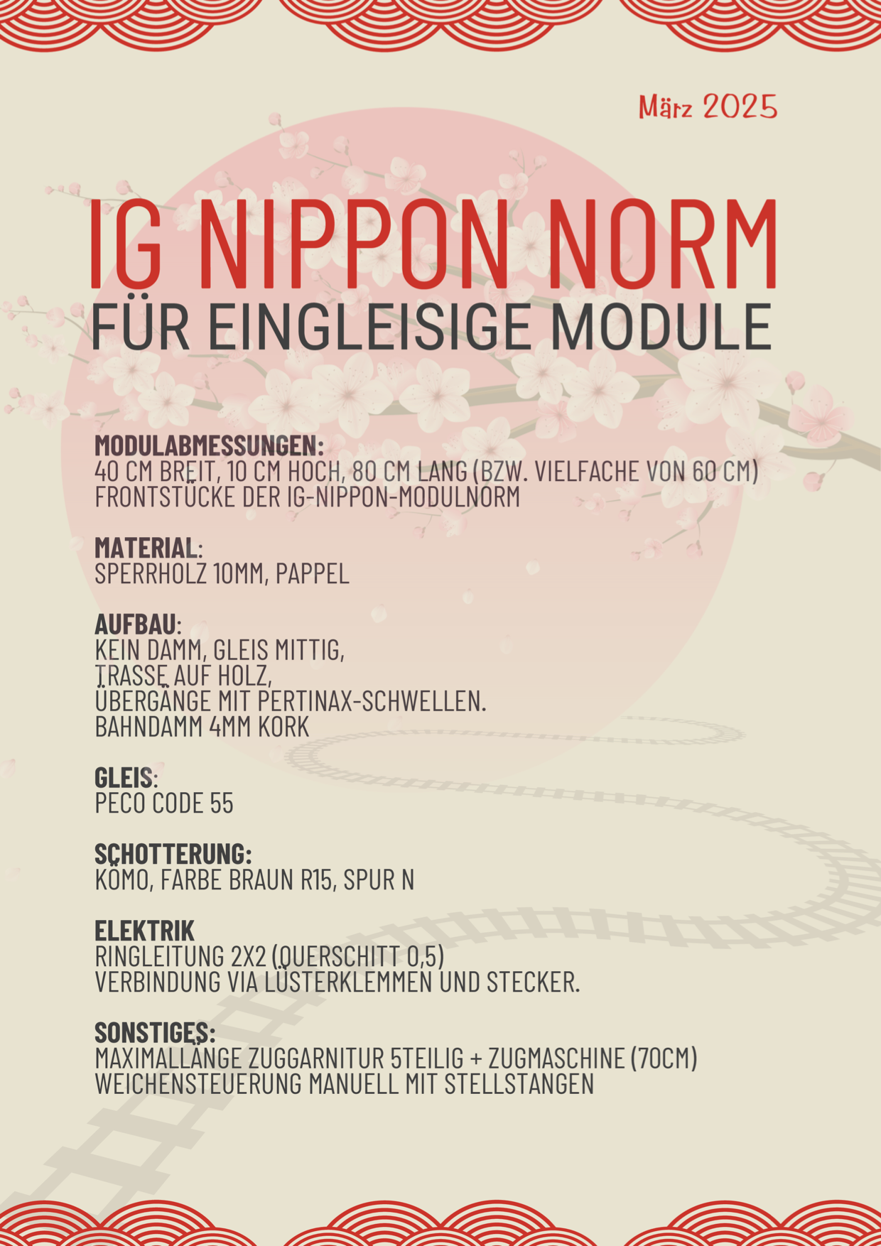 wir haben begonnen an einer Modulanlage mit dem Thema japanische Nebenbahn zu arbeiten. Ziel ist es, diese Module sowohl als eigenständige Modulanlage als auch in Verbindung zu den zweigleisigen IG Nippon Modulen zu betreiben. Mitbauen ist ausdrücklich erwünscht und macht, so meine bisherige Erfahrung, einen Riesenspaß. Alle wichtigen Informationen findet ihr hier in der Modulnorm. LG Markus