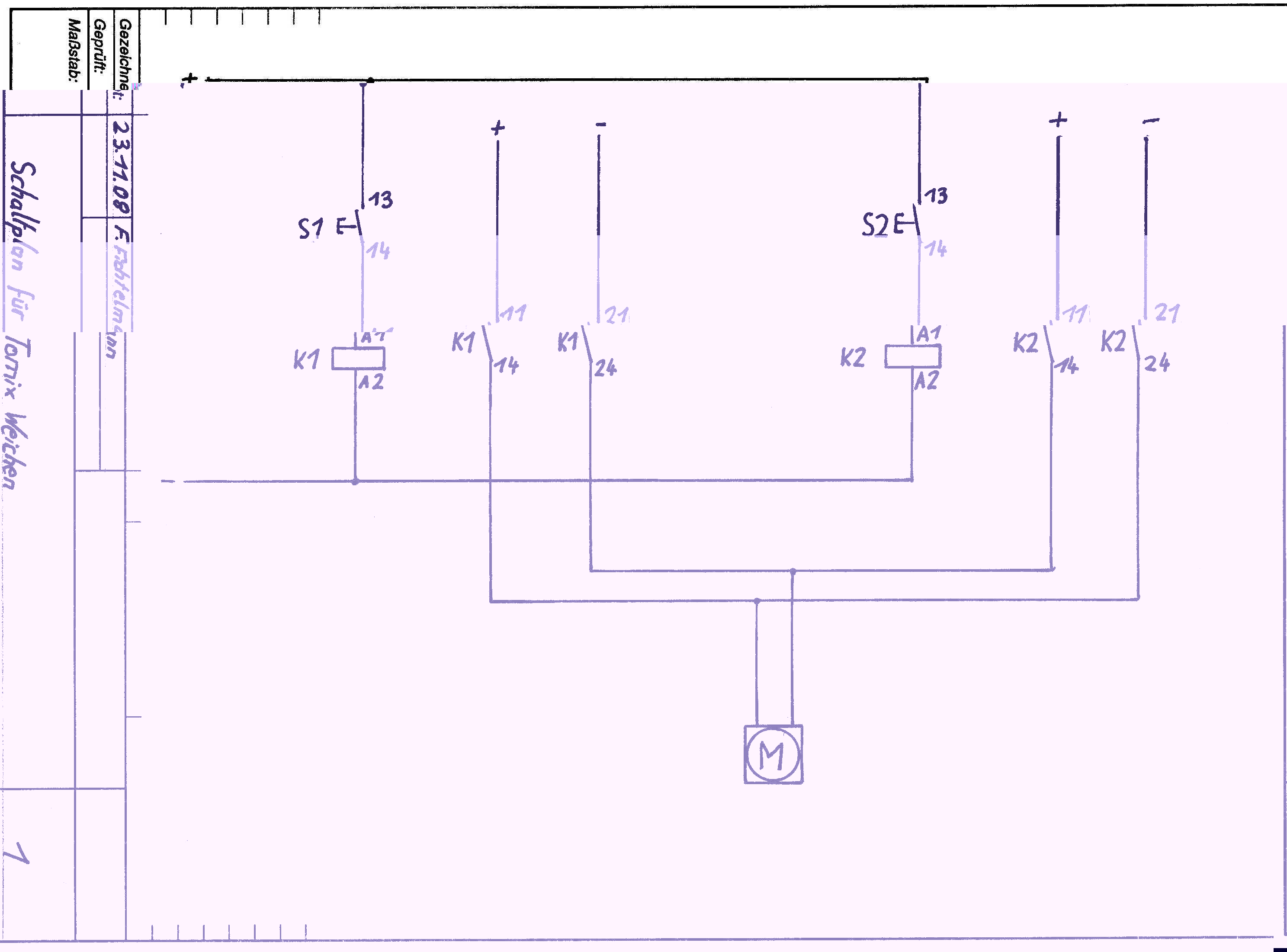 Und als Sicherung, das man nicht beide Taster gleichzeitig Strom auf den Antrieb geben, kann man ja jeweils einen Öffner vor oder hinter den Taster vom anderen Relais legen, so kann es zu keinenm Kurschluss kommen.