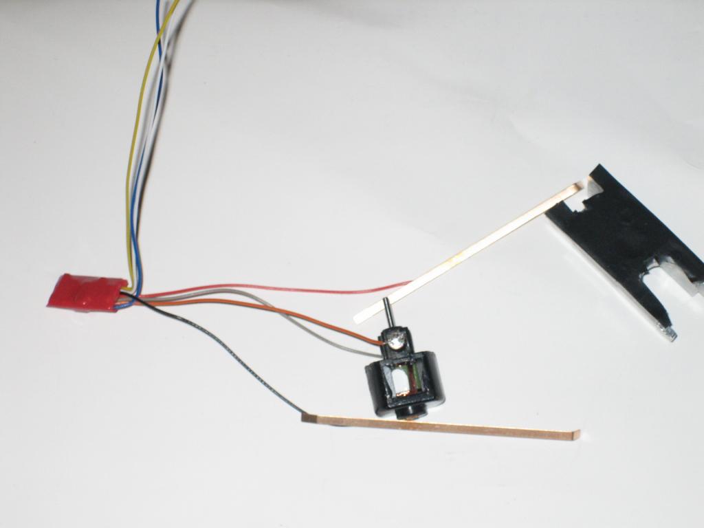 Zuerst die Drehgestelle entfernen. Der Wagen wird geöffnet und die Innereien ausgebaut. Nun lötet man die rote und schwarze Decoderlitze an den Stromleitblechen an. Die graue und orange Litze am Motor. Beim löten zuerst die Bleche und Motorkontakte mit Schleifpapier anrauhen, dann schön verzinnen. Die abisolierten Enden der Litzen werden zuerst auch verzinnt. Dann mit dem Lötkolne wieder an die verzinnte Stelle bis das TZinn Flüssig ist, die Litze dazu. Das wars auch schon mit Löten, geht auch für Grobmotoriker mit zugrossem Lötkolben da alles schön einzeln gelötet wird kann auch sonst nichts verschmoren.