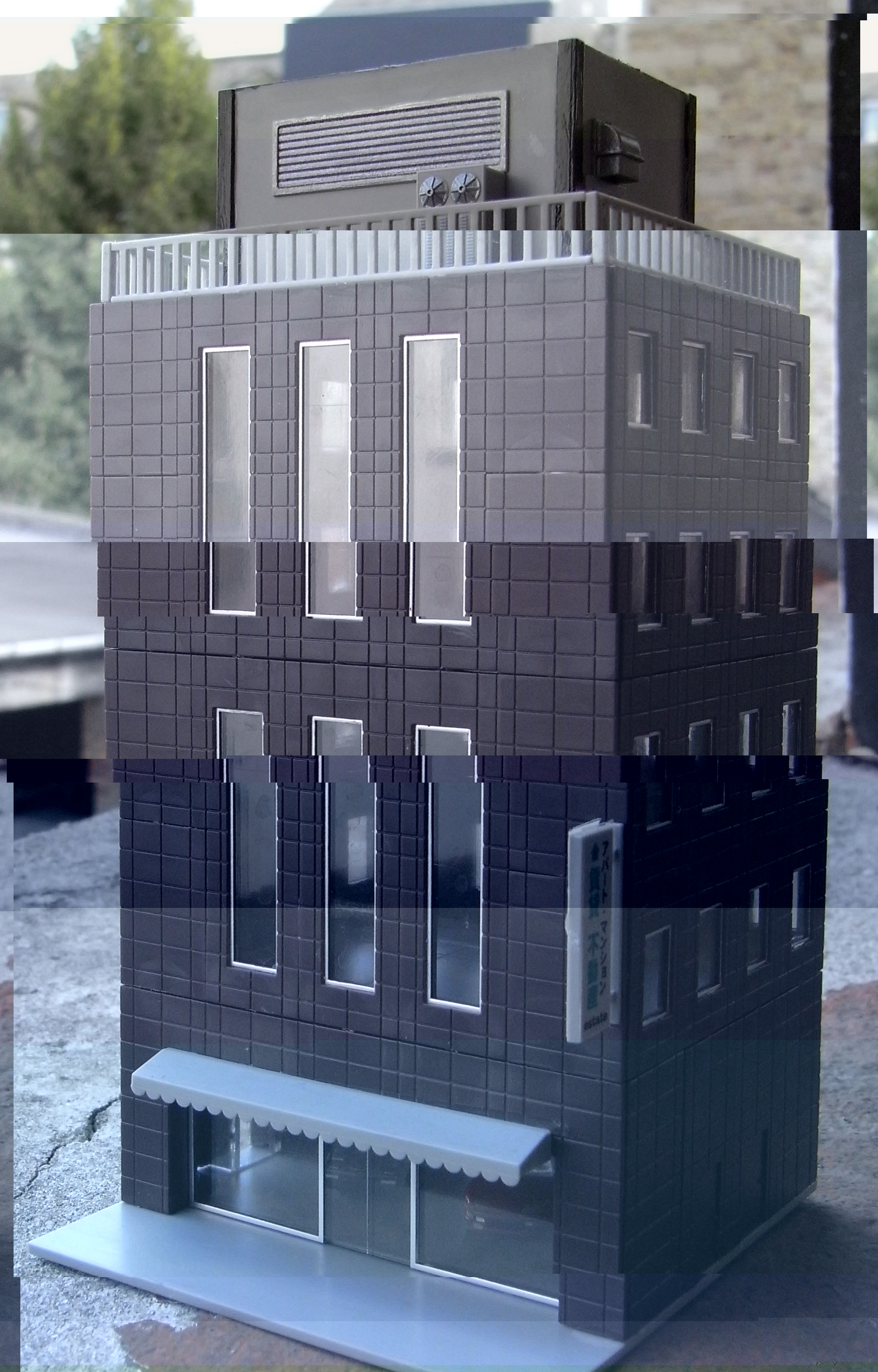 von GreenMax (2101 + 2102) kamen glaube ich schon im letzten Jahr die neuen und vor allem frei kombinierbaren Bürobausätze in braun und beige heraus. Ich habe mal einen Basisbausatz (3 Stockwerke) + einen Ergänzungsbausatz (2 Stockwerke) zusammengebaut. Naja an Detlefs Baukünste werde ich ja nie ranreichen, aber egal. Unten im Haus soll ein Mini-Nissan-Autohaus entstehen. Dafür habe ich schon 2 Fahrzeuge eingeklebt. Die einzelnen Etagen kann ich abnehmen - inkl. der Deckenplatten -. Dadurch kann ich nachträglich noch innen verfeinern und weiter ausbauen.