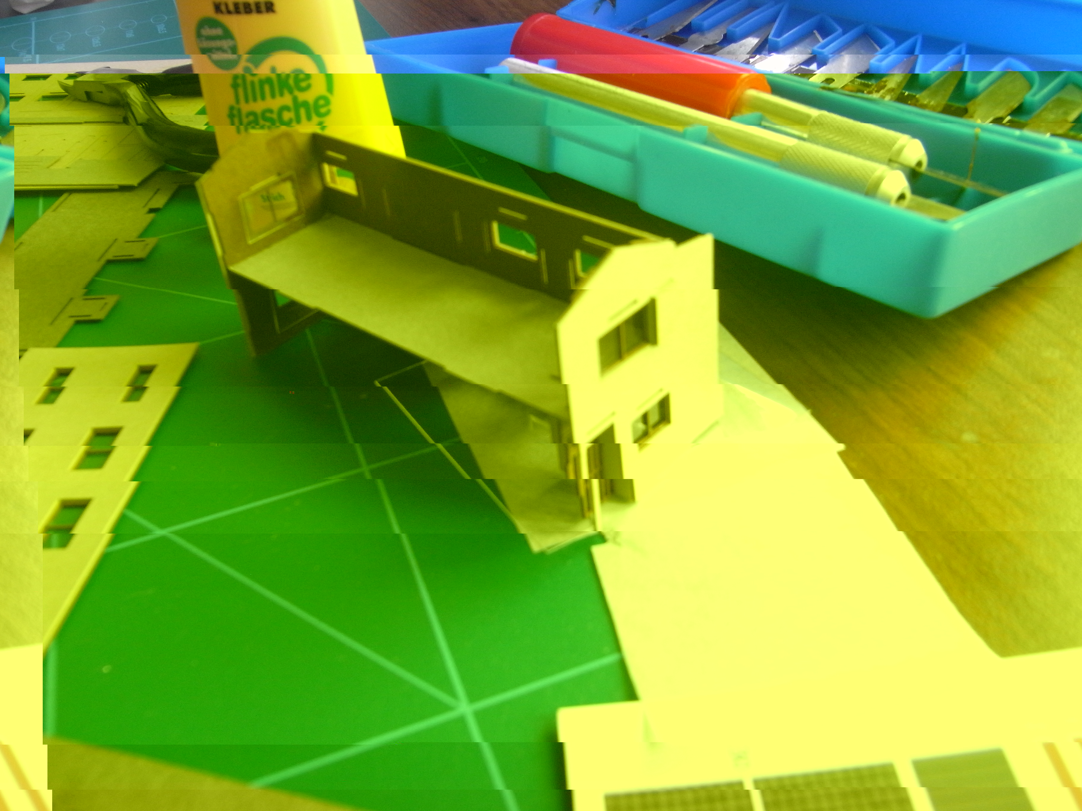 So, nun habe ich meine ersten Erfahrungen mit Papierbausätzen (Pappe) gemacht und bin hellauf begeistert. Nach meinem Dafürhalten sind sie besser zusammen zu bauen als Plastikbausätze, wenn auch alles etwas filigraner ist. Mein Erstlingswerk ist das Apartmentgebäude B no. 56 von Sankei. Klein aber fein und mal was Anderes al die Sachen von Tomytec. Zum Einsatz kam der von Detlef empfohlene UHU Vielzweckkleber, der einem mal keine Kopfschmerzen verursacht
